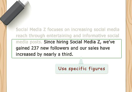 Use specific figures to show impact. Go back to your description of the project you faced. The figures you use to show the results should match the figures you used when describing your problem, so readers can easily compare. For example, if you're hiring a social media management company for your business, and you focused on the low numbers of people following your social media accounts, state specifically how many followers you had after the company you hired went to work.