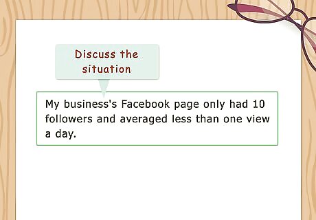 Discuss your situation. Open your testimonial by describing the problem that you were facing before you tried the product or service that is the subject of the testimonial. Be brief, but include as many specific facts as possible. Facts allow people reading your testimonial to compare your situation before and after you used the product or service. Showing this evidence yourself makes the testimonial more helpful to people. Since you still want your testimonial to be brief, only include facts that were directly affected by the product or service. For example, if your business had a problem managing its social media accounts, you might say "My business's Facebook page only had 10 followers and averaged less than one view a day."
