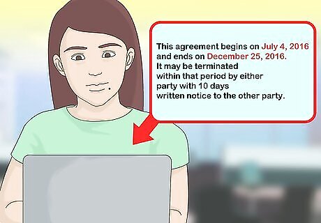 List the dates the agreement is in effect. Most agreements don't continue on in perpetuity. Rather, they are set to expire after a definite period of time. If you want to include a method by which either party may terminate the agreement, you should include that term when you describe the agreement's duration. For example, you might write "This agreement begins on July 4, 2016 and ends on December 25, 2016. It may be terminated within that period by either party with 10 days written notice to the other party." The termination provision (which you also could consider an "escape clause") also should include details on how final compensation will be made or how items such as tools or building materials should be returned.
