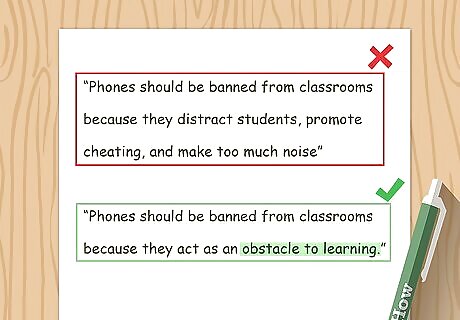 Describe how you're going to prove your point. Round out your introduction by providing your readers with a basic roadmap of what you will say in your essay to support your thesis statement. In most cases, this doesn't need to be more than a sentence. If you've created an outline for your essay, this sentence is essentially the main subjects of each paragraph of the body of your essay. For example, if you're writing an essay about the unification of Italy, you might list 3 obstacles to unification. In the body of your essay, you would discuss details about how each of those obstacles was addressed or overcome. Instead of just listing all of your supporting points, sum them up by stating "how" or "why" your thesis is true. For example, instead of saying, "Phones should be banned from classrooms because they distract students, promote cheating, and make too much noise," you might say "Phones should be banned from classrooms because they act as an obstacle to learning."