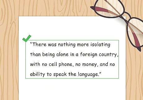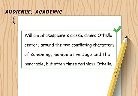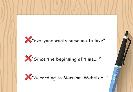 Avoid clichés and generalizations. Generalizations and clichés, even if presented to contrast with your point, won't help your essay. In most cases, they'll actually hurt by making you look like an unoriginal or lazy writer. Broad, sweeping generalizations may ring false with some readers and alienate them from the start. For example, "everyone wants someone to love" would alienate someone who identified as aromantic or asexual.