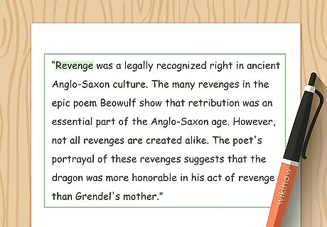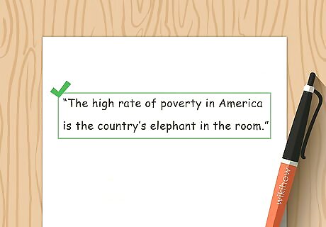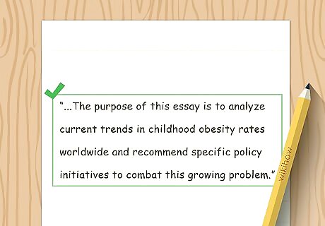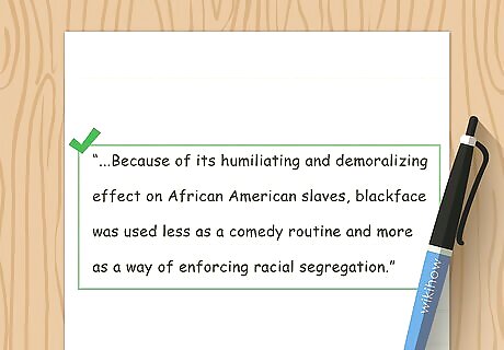 Make your point. After you've set up the context within which you're making your argument, tell your readers the point of your essay. Use your thesis statement to directly communicate the unique point you will attempt to make through your essay. For example, a thesis for an essay on blackface performance might be "Because of its humiliating and demoralizing effect on African American slaves, blackface was used less as a comedy routine and more as a way of enforcing racial segregation." Be assertive and confident in your writing. Avoid including fluff such as "In this essay, I will attempt to show...." Instead, dive right in and make your claim, bold and proud. Your outline should be specific, unique, and provable. Through your essay, you'll make points that will show that your thesis statement is true – or at least persuade your readers that it's most likely true.