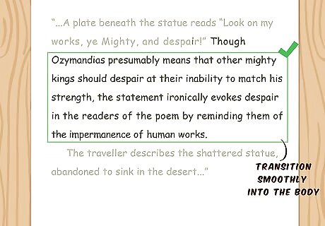 Transition smoothly into the body of your essay. In many cases, you'll find that you can move straight from your introduction to the first paragraph of the body. Some introductions, however, may require a short transitional sentence at the end to flow naturally into the rest of your essay. To figure out if you need a transition sentence, read the introduction and the first paragraph out loud. If you find yourself pausing or stumbling between the paragraphs, work in a transition to make the move smoother. You can also have friends or family members read your easy. If they feel it's choppy or jumps from the introduction into the essay, see what you can do to smooth it out.