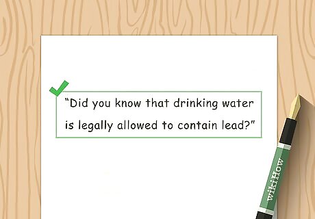 Use the element of surprise. A startling or shocking statistic can grab your audience's attention by immediately teaching them something they didn't know. Having learned something new in the first sentence, people will be interested to see where you go next. For this hook to be effective, your fact needs to be sufficiently surprising. If you're not sure, test it on a few friends. If they react by expressing shock or surprise, you know you've got something good. Use a fact or statistic that sets up your essay, not something you'll be using as evidence to prove your thesis statement. Facts or statistics that demonstrate why your topic is important (or should be important) to your audience typically make good hooks.