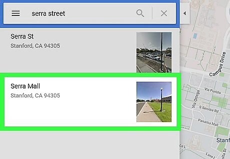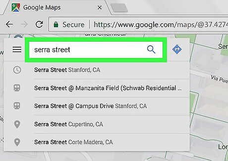 Type a location into the search box. It’s at the top-left corner of the screen. You can type an address, intersection, business, landmark, or any other type of location into the box. A list of results will appear.