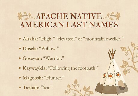 The term “Apache” encompasses several indigenous groups that once occupied the southwestern U.S., including present-day Arizona, New Mexico, Colorado, and Texas. Surnames were actually not common amongst the Apache tribes until the late 1800s and early 1900s, when colonization and westernization began to influence these communities. The names they have used, however, are often very descriptive and may even represent a unique story or legend. Animal names are also very common, and they’re usually used to symbolize a specific virtue. Here are some popular Apache surnames: Altaha: “High,” “elevated,” or “mountain dweller.” Dosela: “Willow.” Goseyun: “Warrior.” Kaywaykla: “Following the footpath.” Magoosh: “Hunter.” Tazbah: “Sea.”