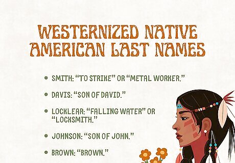 Starting around the 16th century, Europeans began to invade and colonize the ancestral lands of Native American or indigenous tribes. Over the next decades and centuries, Native Americans were forced or expected to take on Westernized last names in order to adapt to European culture. These new surnames were typically English or Spanish, or a translated version of a historically Native American name, and they’ve remained common in Native populations to this day. Here are some examples: Smith: “To strike” or “metal worker.” Davis: “Son of David.” Locklear: “Falling water” or “locksmith.” Johnson: “Son of John.” Brown: “Brown.” Thunderhawk: The Anglicized version of the Native surname Četaŋ Wakiŋyaŋ, which directly translates to “hawk thunder.”