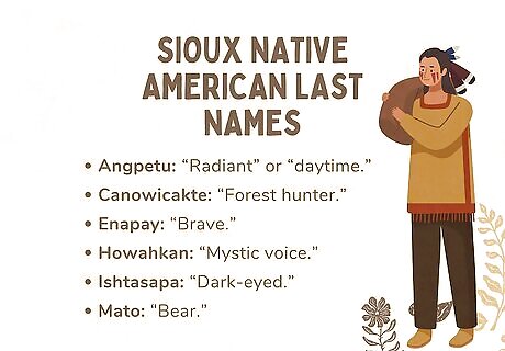 The Sioux peoples include the Dakota, Lakota, and Nakota Tribes that originated from (an area now known as) Wisconsin and Minnesota. Later on, the Sioux migrated to the Great Plains, encompassing modern-day North Dakota, South Dakota, Nebraska, Montana, Colorado, and Wyoming. The unique surnames of the Sioux could actually change over a person’s lifetime to better reflect their personal growth and significant achievements. However, it was common to combine these names with a clan or family name that was passed down through generations. Here are some common ones: Angpetu: “Radiant” or “daytime.” Canowicakte: “Forest hunter.” Enapay: “Brave.” Howahkan: “Mystic voice.” Ishtasapa: “Dark-eyed.” Mato: “Bear.”