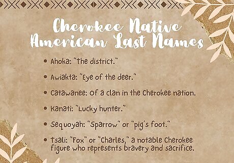 The Cherokee peoples are an indigenous Native American group that historically inhabited the southeastern United States, including areas now known as Georgia, Tennessee, South Carolina, and North Carolina. Cherokee Nation’s naming practices have historically focused on descriptive and personalized names that correlate to someone’s personality, appearance, or achievements. Here are some common and popular Cherokee surnames: Ahoka: “She brings happiness.” or "Without sorrow" Awiakta: “Eye of the deer.” Catawanee: Of a clan in the Cherokee nation. Kanati: “Lucky hunter.” Sequoyah: “Sparrow” or “pig’s foot.” Tsali: “Fox” or “Charles,” a notable Cherokee figure who represents bravery and sacrifice.