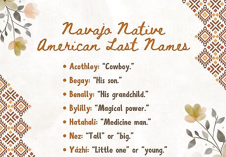 The Navajo (or the Diné, in their own language) are a nomadic people who historically lived in the southwestern part of the United States—including modern-day Arizona, New Mexico, and Utah. Like many indigenous tribes, Navajo surnames were not traditionally passed down from family member to family member. Rather, each person had a unique surname that reflected their personal characteristics and physical features. This largely changed in the 20th century, when Western practices impacted the Navajo, leaving us with the common Navajo surnames that we know today: Acothley: “Cowboy.” Begay: “His son.” Benally: “His grandchild.” Bylilly: “Magical power.” Hatahali: “Medicine man.” Nez: “Tall” or “big.” Yázhí: “Little one” or “young.” In modern times, this surname is often written as the Anglicized “Yazzie.”