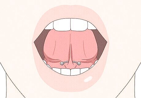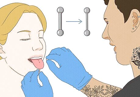 Get your jewelry changed out for the first time by your piercer. Once all of the swelling goes down (which is typically around 1 month), visit your piercer to get your jewelry downsized. Your piercer will take out the original jewelry and replace it with a shorter piece that fits inside your tongue more snugly. This is an important step, as keeping in the longer jewelry can lead to gum or teeth issues.